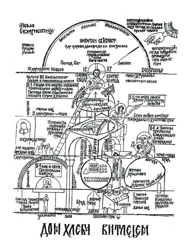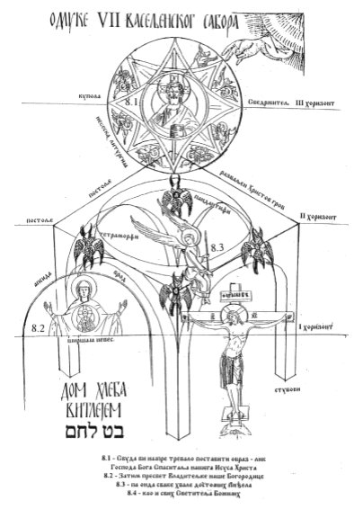 Тело са прве табле, које се дели, чиновима дељења и сабирања путује читавим низом табли, без обзира на своју несамерљиву величину. Раван на другој табли је епифанија – појављивање Христа. Зато ћемо у нашем Дому Хлеба прво видети једну изабрану половину преполовљеног Тела, са живописаним ликом Исуса Христа, Пантократора, Сведржитеља Неба и Земље, господара Васељене и то на висини изнад горњег боја. То је прва причест водом и чудо Богојављења. Речено језиком техничког описа грађевине, то је купола, са тамбуром, низом прозора и низом анђела Небеске Литургије на унутрашњем хоризонту, уздигнутом на горњи бој постоља жртвеника, у нивоу космичког хоризонта.
