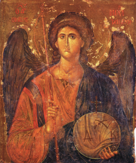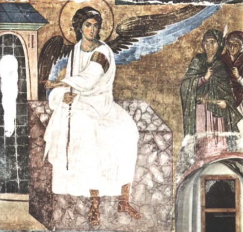 Сада се из брода грађевине пењемо на постоље, коцку са оштрим угловима у висини горњег боја где се, са унутрашње стране воздуха – простора, на троугаоним једрима, изворно живопишу, као на Светој Софији у Цариграду, четири Арханђела: Михаило, Рафаило, Гаврило и Уриил, док на спољашњој страни овог боја седи Бели анђео, најчувенији српски живопис, који показује разваљен гроб васкрслог Христа. Он седи на камену гроба, који је представљен као геометријски, или логосно савршена равнострана мермерна коцка, камен темељац цркве. У стварности, никада се гробна плоча не обликује на тај начин, али зато свако постоље православне цркве, на које слеће лопта Тела Христовог има изражене углове коцке. У каснијем развоју и уздизању цркве, анђели се пењу у Труло куполе, а на пандантифима се живопишу четири јеванђелиста, Матеј, Марко, Лука и Јован. Постоље, дакле, представља престо и празан Христов гроб. Пандан – насупрот и таф – гроб, је јелинска, а не француска реч, која значи разваљен Христов гроб васкрслог Христа.