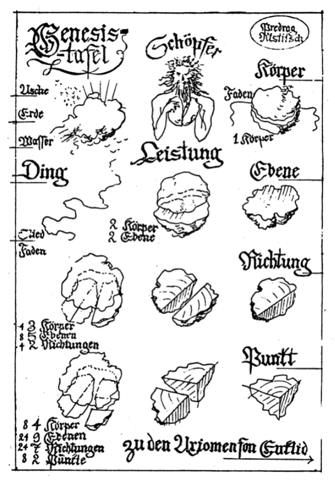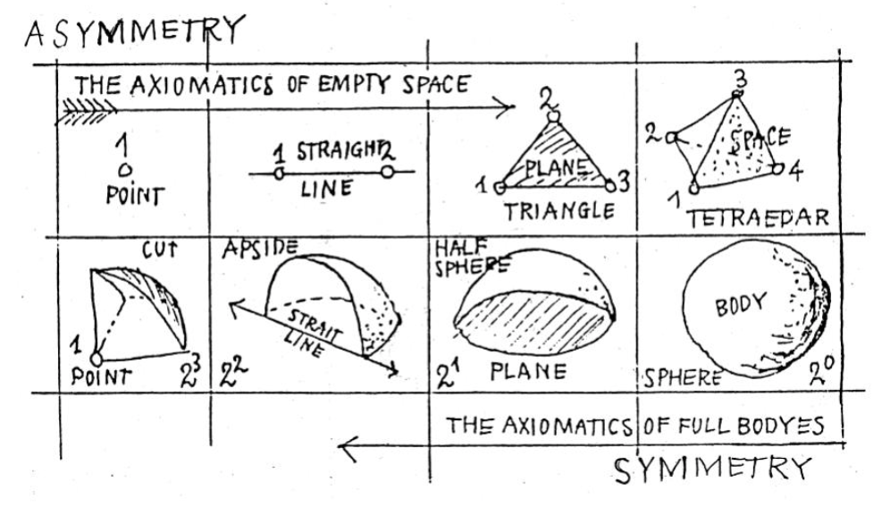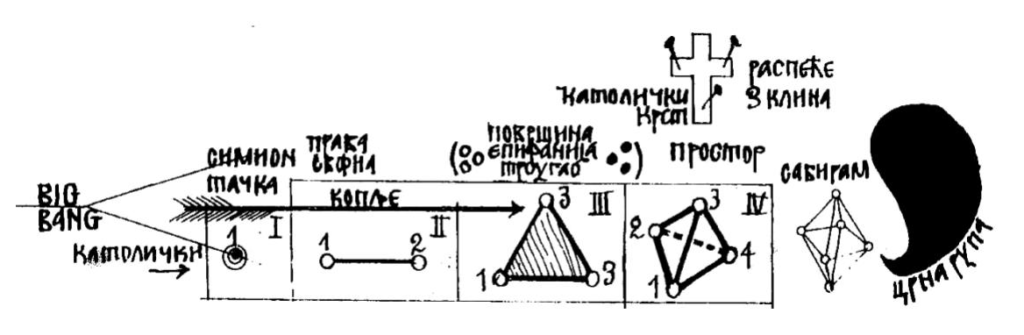 Ми ћемо се у нашем посматрању вечних, никада озбиљно неуздрманих, достојних axiоz – аксиома и ограничити само на оно најнужније, али просторно довољно аксиоматско језгро, у једном предложеном систему, у коме је постављено да се простор ниже и развија од тачке. Евклидову поставку да се тачка не може делити ћемо онда поставити да се све тачке, изван почетне, могу додавати, сабирати и множити до бесконачности и бесмисла. Овакав поступак биће најкарактеристичнији и најзанимљивији почетак нашег излагања.