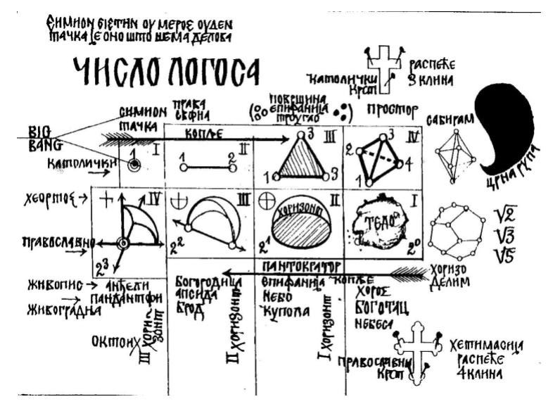 Евклидови аксиоми, у свом основном облику, без икаквих промена су сложени у два упоредна и наспрамно повезана низа, тако да својим геометријским сликама јединствено представљају ликове и чине основне облике, слике црквене архитектуре, живописа, па и акустике, као и остале категорије у вековима непроменљиве догме са обе стране. Тако, на представљеној табли, у једном правцу се ниже католичка традиција, а у наспрамном правцу православна традиција. Стојим на становишту да није могуће истовремено оперисати у оба правца по појму неоштрине (Unschärfe Raltion – Schrödinger), што се показује у оштрим поделама између православних и католика у свим вековима, па и у савременом хришћанском животу.