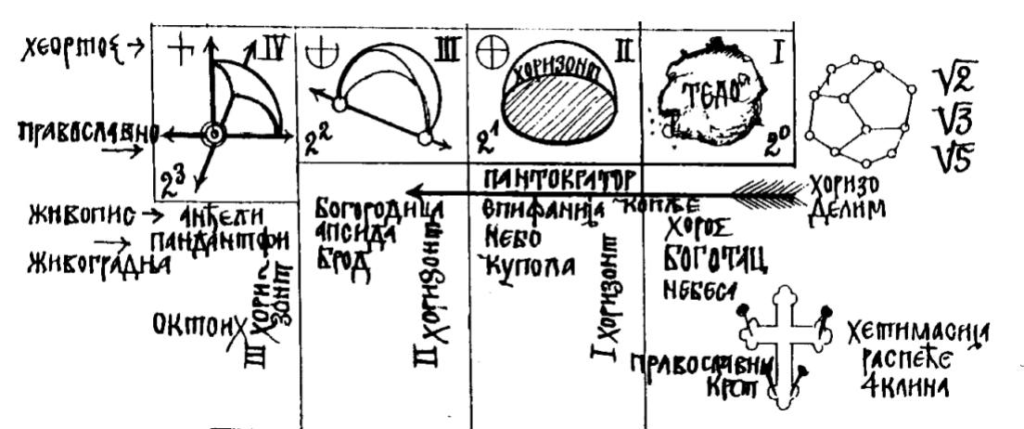 Трећим потезом дељења добија се тачка. Но, ова тачка се сада битно разликује од Евклидове тачке, зато што је стабилна, јер је део пуног Тела. Ова кришка, једро, осмина Тела, октоих, који је опет цело Тело, само има један цео угао зида, односно четири угла који затварају кутове у кућу, Дом. Зид је са све четири стране, а четири тачке већ одређују Тело. Оне су једина приступачна веза између онога што се може додирнути и онога што не може, Космоса. Овај камени блок је узглавље Јаковљевог сна, он је темељац цркве, у којој се анђели лествама пењу и силазе са Небеса.