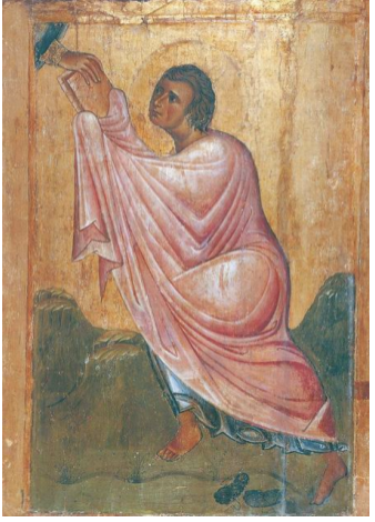 Са Неба силази на земљу, на равно тло, широко до хоризонта. На бојиште силази и сидри се војска Небеска, искрцавају се анђели, наоружани копљима, у праскозорје Старог завета и пресудна битка – чин Литургије треба да почне. Колико је пространо то поље, које се трком никад не може досегнути, дочарава у малом човеку прихватљива слика космичког хоризонта. То је први еденски бој на тлу, то је Црква еденска.